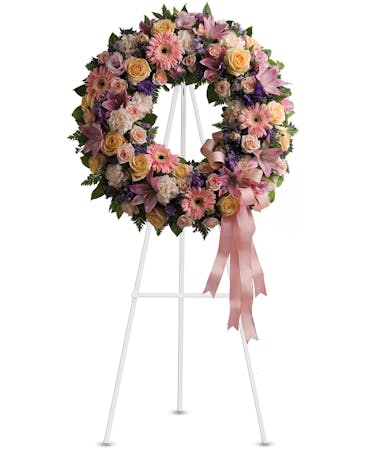 A graceful, feminine wreath created with a range of beautiful blossoms in peach, pink, crème and lavender is a lovely depiction of your warm feelings and devotion. The Graceful Wreath flower arrangement is delivered on an easel, for display at a funeral service or wake.