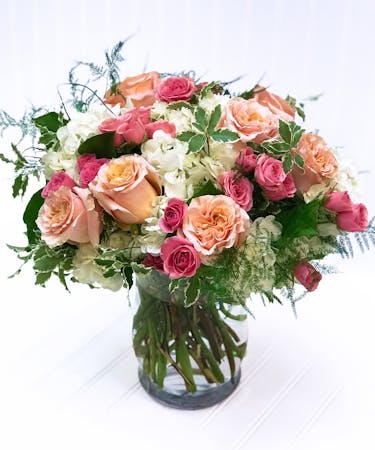 Soft, romantic, and timeless — Juliette pairs cloud-like white hydrangeas with delicate pink and spray roses, creating a graceful arrangement perfect for life's sweetest moments.